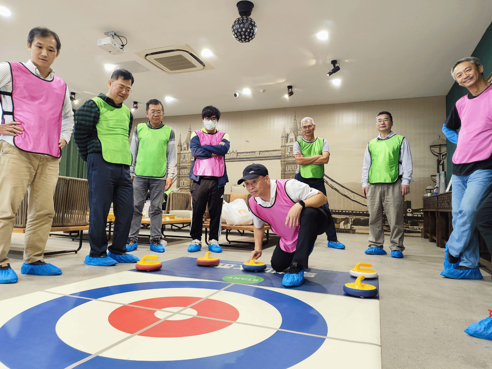 活动前,教练通过暖场小游戏拉近彼此之间的距离,现场氛围迅速热烈起来,大家欢声笑语不断。进入正式比赛,教练将参加人员分为四队,并认真讲解了冰壶赛的比赛基本规则、计分规则、操作细节,确保上场前人人知晓游戏玩法。