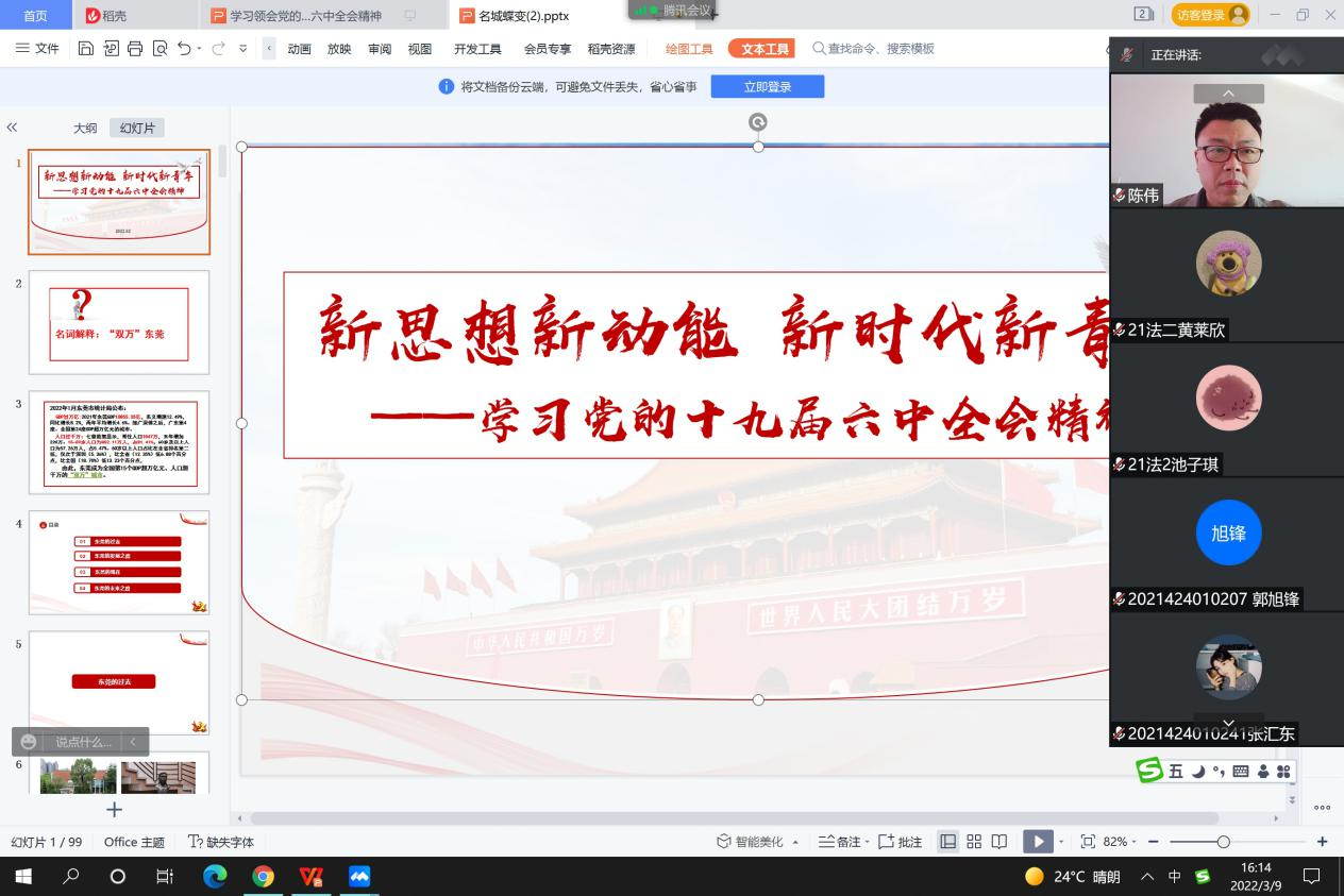 为深入学习贯彻党的十九届六中全会精神,进一步深化拓展党史学习教育,3月9日,w66旗舰厅经理陈伟于线上为21级法社1班、2班,21级社工1班、2班员工上思政课。