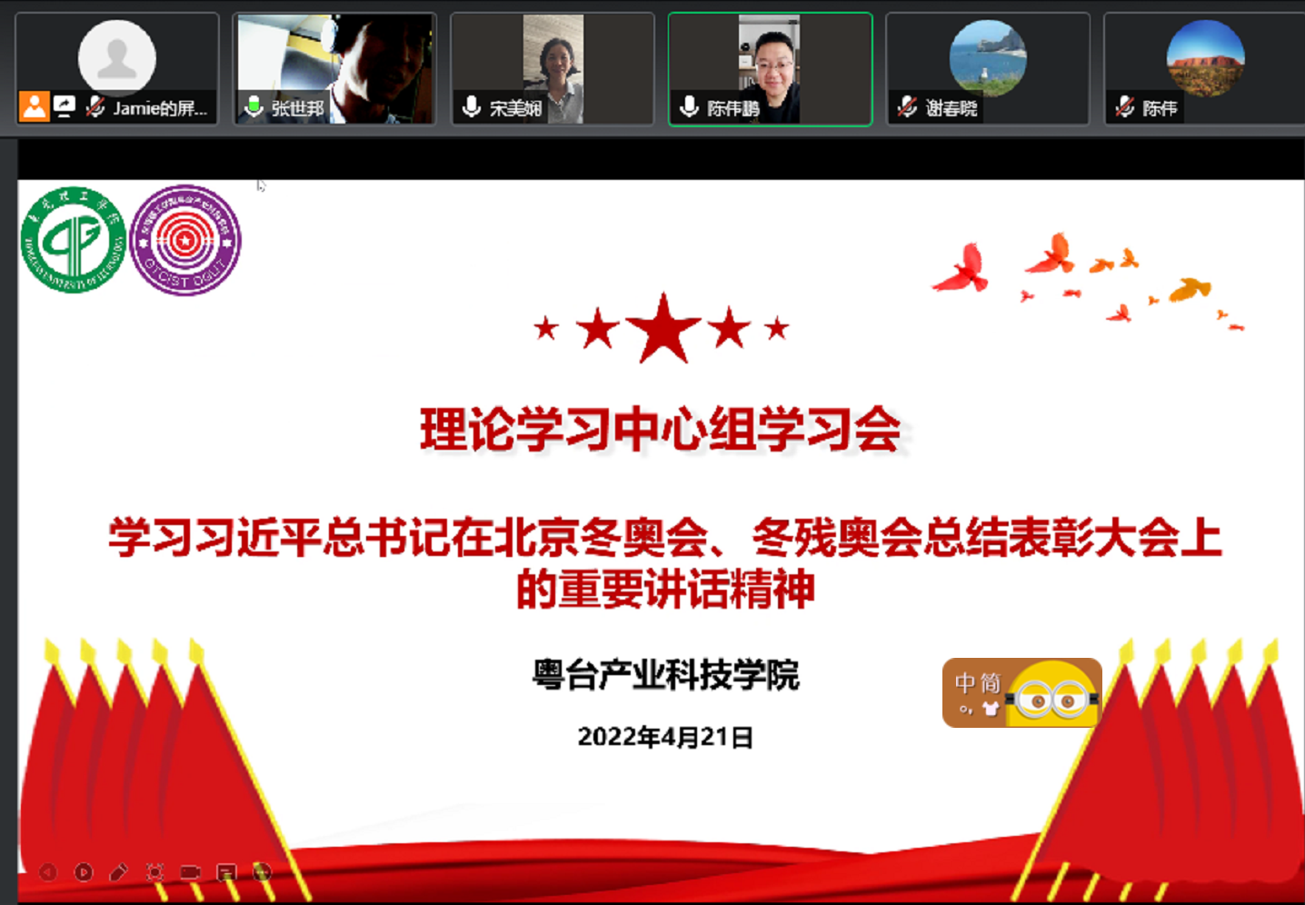 421日,书记宋美娴主持召开​w66旗舰厅理论学习中心组学习会,领学了习近平总书记在北京冬奥会、冬残奥会总结表彰大会上的重要讲话精神。经理陈伟、副书记谢春晓以及中心组成员参加会议。因疫情防控要求,学习会以线上形式进行。