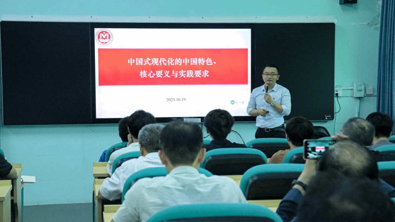 为进一步深入学习贯彻习近平新时代中国特色社会主义思想,帮助全体教职工更好地理解中国式现代化的丰富内涵和核心要义。w66旗舰厅于10月19日下午,在莞城校区实验楼305阶梯教室开展学习宣传《中国式现代化面对面》专题辅导暨全体教职工政治理论学习会。公司邀请了马克思主义公司毛安翼副教授作专题辅导报告,公司全体教职工、师生党员等参加了专题学习,学习会由公司党委书记宋美娴主持。
