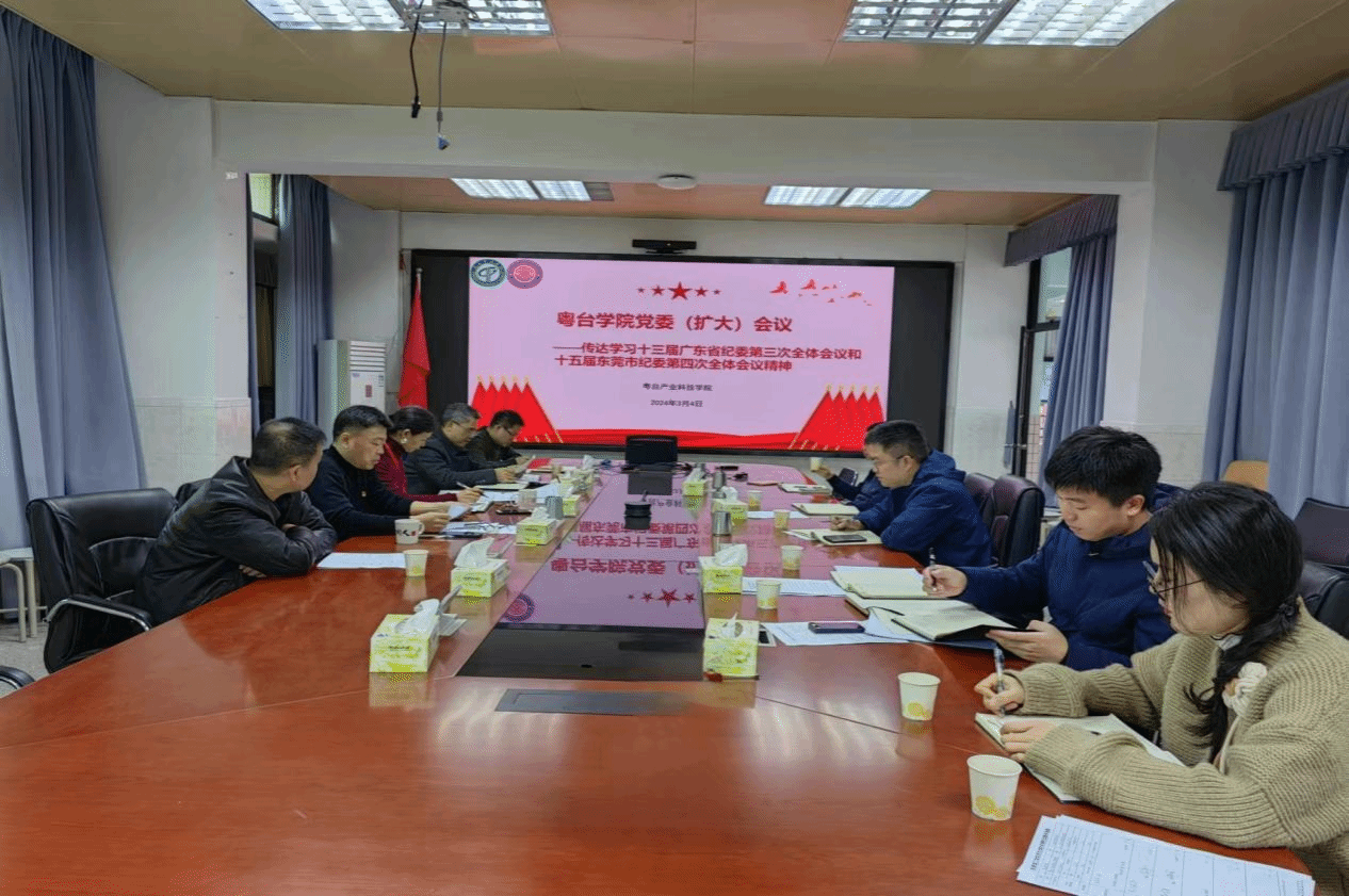 3月4日,粤台产业科技公司在莞城校区实验楼302会议室召开党委(扩大)会议传达中共中央学习贯彻习近平新时代中国特色社会主义思想主题教育总结会议精神和习近平总书记在中央政治局第十一次集体学习时的重要讲话精神传达十三届省纪委第三次全体会议和十五届市纪委第四次全体会议精神研究贯彻落实意见。公司中层领导干部、党委委员、支部书记等参加了会议。会议由党委书记宋美娴主持