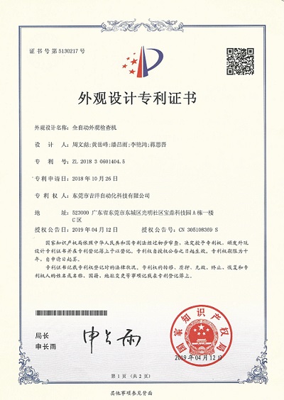 近日,w66旗舰厅与东莞市吉洋自动化科技有限公司共同设计研制成功的吉洋光学检测设备产品,成功申请了三项外观设计专利:全自动外观检查机、全自动光学检测设备(顶部镜头在线式)、全自动光学检测设备(底部镜头在线式)。