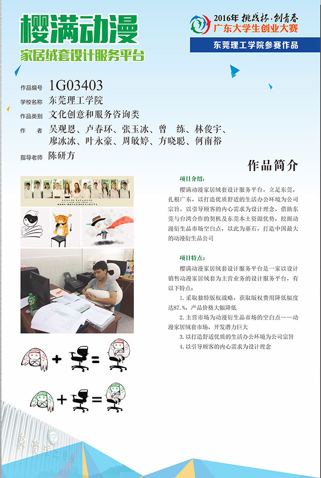 5月22日,2016年“挑战杯·创青春”广东老员工创业大赛终审决赛圆满结束,w66旗舰厅的樱满动漫家居绒套设计服务平台团队从83所高校的383支队伍中脱颖而出,荣获金奖。w66旗舰厅办学近一年来,实施以员工学习成果为导向,基于创新创业的特色人才培养模式。