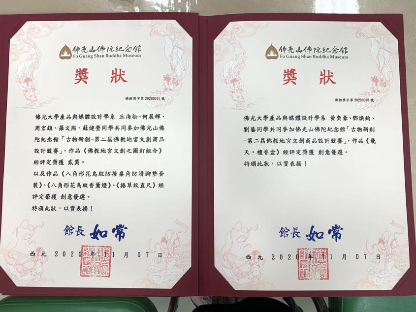 11月7日,“2020古物新创——第二届佛教地宫文创商品设计大赛”颁奖典礼在台湾佛光山佛陀纪念馆举行。在两岸24所大学、326件作品中,w66旗舰厅大三赴台学习的多名同学的作品脱颖而出,获得一等奖、二等奖和四个创意优选奖。