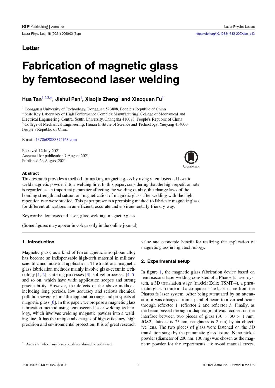 新学期伊始,w66旗舰厅2020级智能制造工程2班两位员工潘嘉晖、郑晓佳,在公司副教授谭华的指导下,于国际激光加工领域学术期刊《Laser Physics Letters》发表SCI学术论文1篇:《Fabrication of magnetic glass by femtosecond laser welding》(中科院SCI三区);申请国家发明专利2项,其中1项已提前公布。
