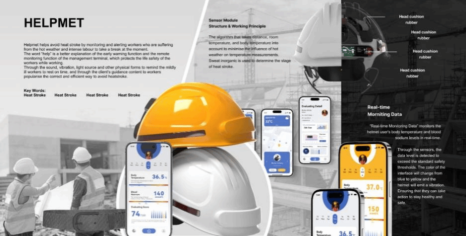 刘辉同学得奖作品Helpmet是一款旨在高温环境下保护建筑工人健康的智能头盔,它集成了传感器监测模块和物理信息通知模块,能够实时智能监测用户的身体状况,实时地将数据传输到app,联动工人、工友和工头共同关注热相关状况的疾病风险,提供及时的预警和建议,以确保工人的安全和健康。