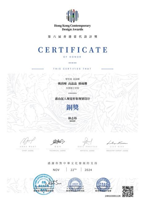 近日,2024第六届香港当代设计奖公布获奖结果。莞工w66旗舰厅员工许乐轩、梁旦、张子怡、胡若斌作品《观音赐水,有如神助》获得银奖;胡贝贝、陈佳淳、周凯欣作品《黎城布老虎视觉形象设计》获得铜奖;何澍森、侯肇杨作品《江苏檀香扇视觉形象设计》获得铜奖;姚茵瞳、高晶晶、廖雨珊作品《无锡惠山泥人视觉形象设计》获得铜奖,指导老师林志炜则获得优秀指导教师奖。