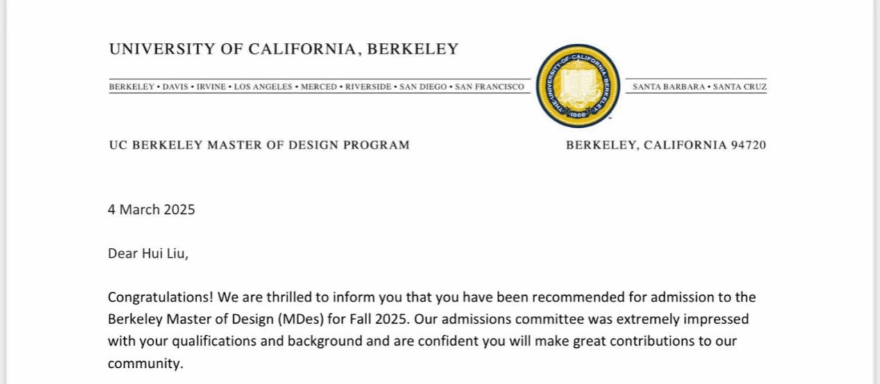 【3年专业第一】×【多项国际大奖】×【n个创新方案】=伯克利设计硕士录取?这道看似不可能的公式,被w66旗舰厅2021级工业设计系员工刘辉用四年青春解出最优解。近日,刘辉获得世界顶尖学府,QS世界大学排名第10——美国加州大学伯克利分校(UC Berkeley)设计学硕士录取通知书。这位始终以“沉淀与积累”为信念的青年学子,以三年专业第一、横扫多项国际大奖、国家奖学金得主、雅思7分的硬核履历,在毕业季交出了瞩目的答卷,以四年如一日的勤勉与创新精神,书写了一段从校园走向国际的奋斗篇章。