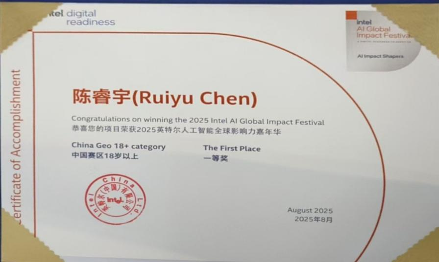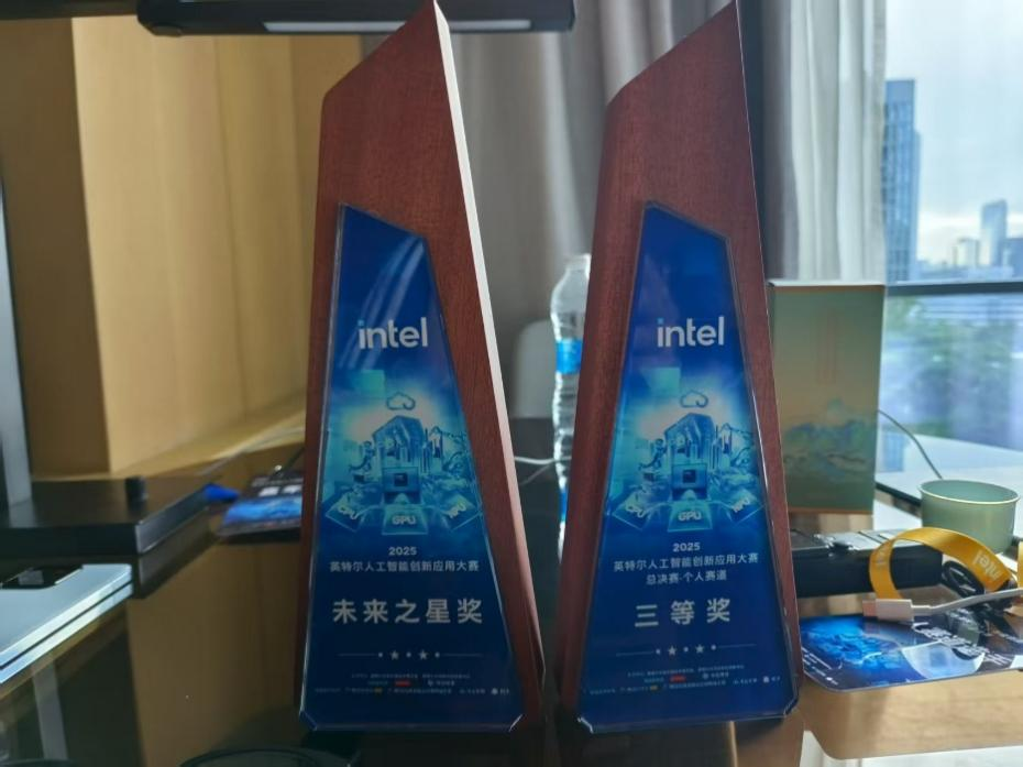 8月16日,2025英特尔人工智能创新应用大赛总决赛在深圳圆满落幕。本届大赛吸引了2817支参赛团队,提交作品1063份,大赛总热度达到5400万,是国内人工智能领域最具影响力的创新赛事之一。来自全国各地的参赛团队和个人选手围绕工业、教育、医疗、心理健康、游戏等领域展开巅峰对决。最终,经过激烈角逐,本院23级电商员工陈睿宇在众多比赛团队中脱颖而出,一举斩获”全球影响力嘉年华一等奖”、“个人赛道三等奖”和“未来之星奖”三项殊荣。